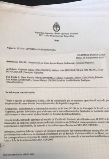 «Se encuentra operativo para la importación de carne bovina fresca deshuesada a la República Argentina», dice el texto aprobado por la entidad, y remitido a las autoridades brasileras, para que los interesados comiencen los trámites para la comercialización.