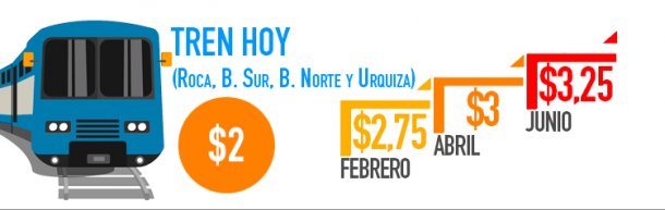 El boleto mínimo de tren para las líneas Roca, Belgrano Sur, Belgrano Norte y Urquiza, que hoy cuesta 2 pesos pasará a costar $ 2,75 en febrero; 25 centavos más en abril y otros 25 centavos más en junio.