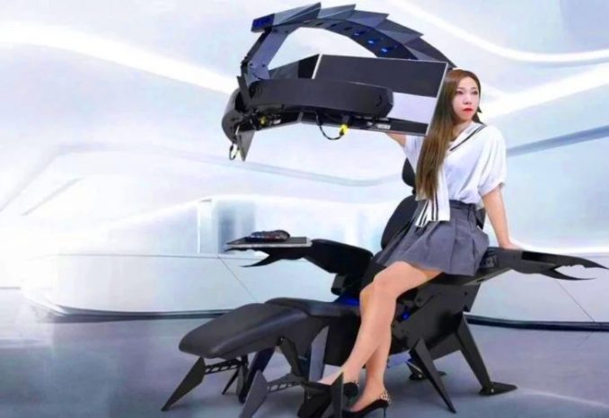 Esta silla está especialmente diseñada para que disfrutes tus videojuegos favoritos, y bueno, si sigues trabajando en casa también te hará mucho más cómoda tu labor, y es que no es una silla común, sino que la puedes acomodar en diversas posiciones y su “cola de escorpión” hace que las pantallas también las puedas mover a tu antojo de forma mecanizada; con solo apretar unos cuantos botones puedes mover toda la estructura sin peligro. En el espacio para la pantalla puedes colocar una enorme, dos o hasta tres más pequeñas, como se ve en la foto.
