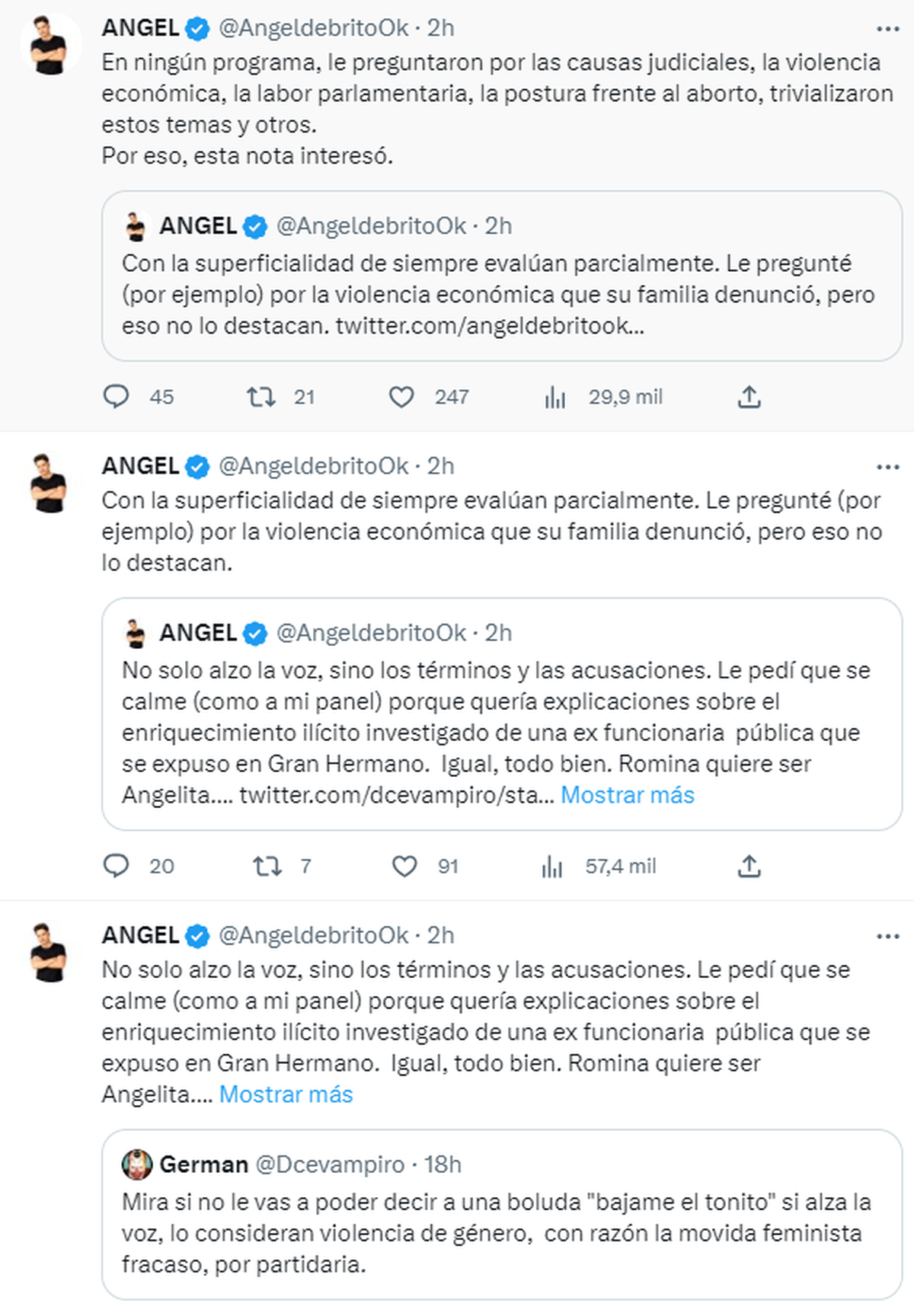 Ángel citó ese tuit y agregó: «No solo alzo la voz, sino los términos y las acusaciones. Le pedí que se calme (como a mi panel) porque quería explicaciones sobre el enriquecimiento ilícito investigado de una ex funcionaria pública que se expuso en Gran Hermano. Igual, todo bien. Romina quiere ser Angelita».