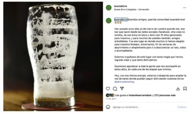 Ambos cierres se produjeron de manera reciente y a muy pocas cuadras de distancia. Una de las cervecerías artesanales que bajó la persiana es Buena Birra Social Club, que estaba ubicada en Zapiola 1353, Colegiales, y anunció el cese de sus funciones en su cuenta de Instagram.
