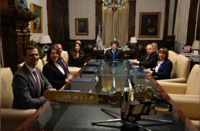 Al término, Noem fue acompañada al despacho del presidente Javier Milei para concretar el encuentro que contó además con la presencia de los ministros Patricia Bullrich (Seguridad), Gerardo Werthein (Relaciones Exteriores, Comercio Internacional y Culto) y Luis Caputo (Economía), aunque este último evitó salir en la fotografía que difundió presidencia.