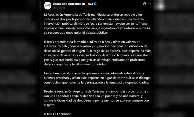 Ante el revuelo generado por las declaraciones de la conductora, la Asociación Argentina de Tenis (AAT) emitió un comunicado oficial en el que expresó su enérgico repudio: “La Asociación Argentina de Tenis manifiesta su enérgico repudio a los dichos vertidos por la periodista Julia Mengolini, quien en una reciente intervención pública afirmó que ‘para ser tenista hay que ser tonto’, una expresión que consideramos ofensiva, estigmatizante y contraria al espíritu de respeto que debe guiar el debate público”.
