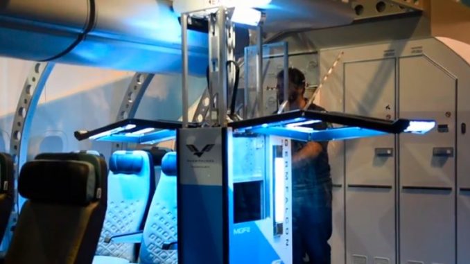 El GermFalcon también está diseñado para navegar en la cabina de un avión, con lámparas UVC ubicadas estratégicamente que pueden exponer todas las superficies de alto contacto a la luz ultravioleta.