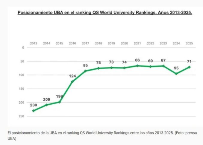 La Universidad de Buenos Aires (UBA) ha vuelto a ascender en un prestigioso ranking internacional de universidades, destacándose como la mejor de América Latina. Según el ranking de la consultora británica Quacquarelli Symonds (QS), la UBA se ha posicionado en el puesto 71 del mundo, subiendo 24 lugares desde el puesto 95.