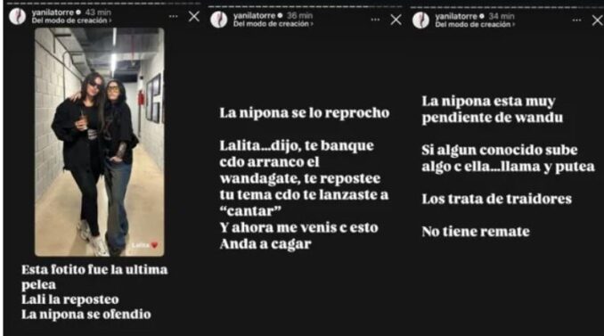 “Esta fotito fue la última pelea. Lali la reposteó, la nipona se ofendió”, explicó Yanina. “La nipona se lo reprocho. Lalita…dijo, te banqué cuando arrancó el Wandagate, te respoteé tu tema cuando te lanzaste a «cantar» y ahora me venís con esto. Andá a cagar» detalló