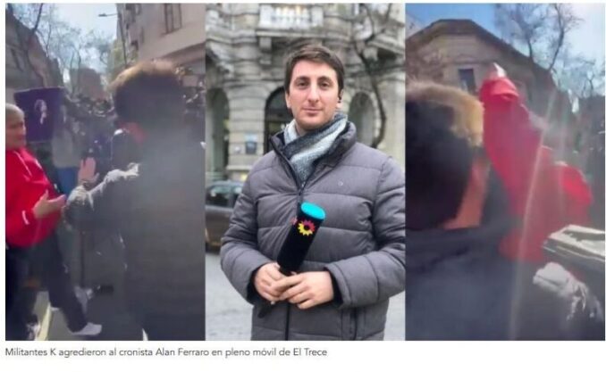 El cronista Alan Ferraro fue agredido y amenazado por militantes K mientras realizaba un móvil en vivo para Mediodía Noticias (El Trece) durante una guardia en la puerta de la casa de Cristina Fernández de Kirchner, tras el reciente fallo de la Corte Suprema.