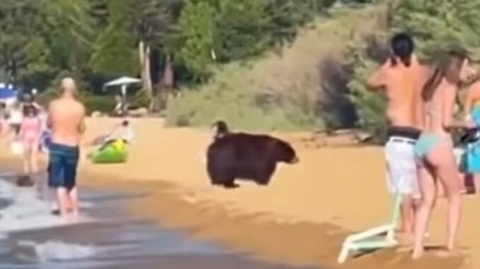 El hecho ocurrió el pasado domingo en la playa Pope de South Lake Tahoe, cuando un ejemplar de oso negro se presentó con sus tres crías.