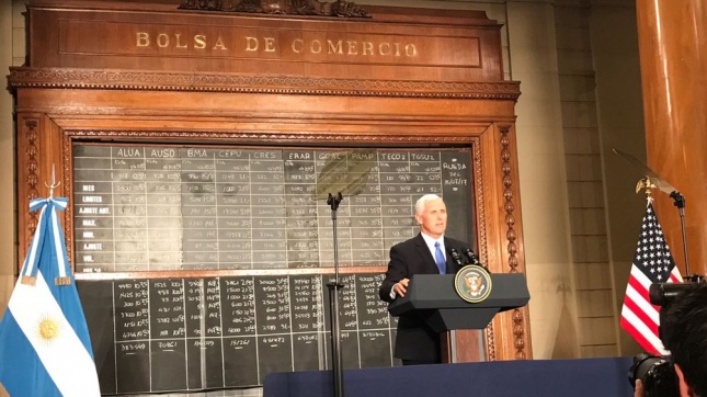 El vicepresidente de Estados Unidos, Mike Pence, afirmó esta tarde en su discurso en la Bolsa de Comercio que «el liderazgo del presidente (Mauricio) Macri trajo reformas audaces que devolvieron la reputación a la Argentina en el mundo», y anunció que «pronto habrá un acuerdo» que beneficiará las exportaciones de cerdo a su país.