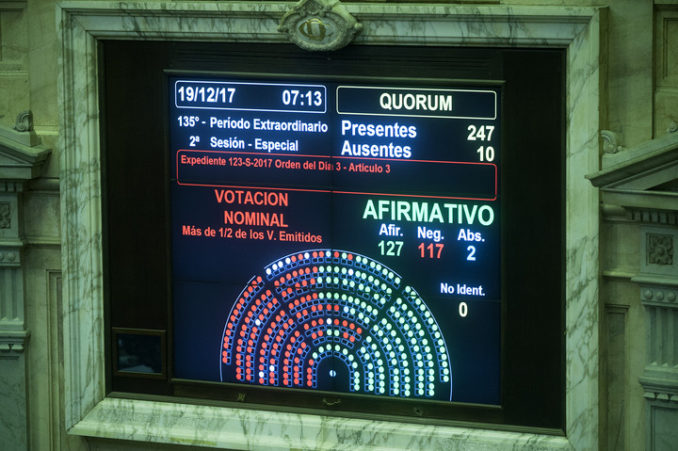 A las 7.05 esta mañana, el oficialismo de Cambiemos y la Casa Rosada pudieron festejar: la reforma previsional se convirtió en ley en la Cámara de Diputados, con 127 votos a favor, 117 en contra y 2 abstenciones. Fueron diecisiete horas de sesión, sin interrupciones, con los ecos en el recinto de los graves enfrentamientos en las calles a lo largo del lunes y un cacerolazo de miles de manifestantes que se movilizaron ya de noche hasta los vallados que impidieron acercarse al Congreso.