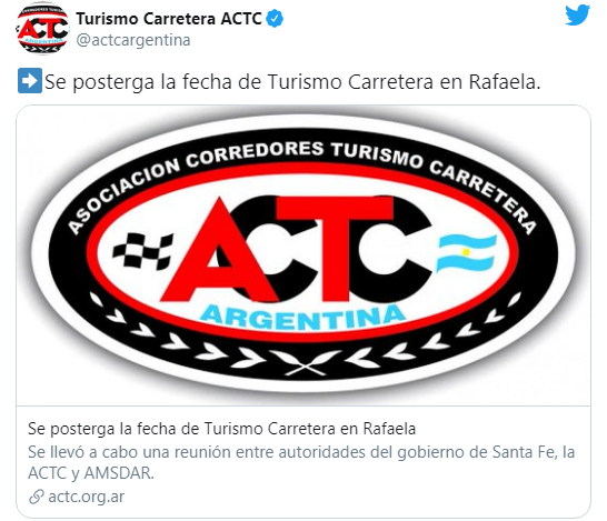 Luego de una reunión que este lunes mantuvieron la ACTC junto a representantes del gobierno de Santa Fe, del municipio de Rafaela y la Asociación Mutual Social y Deportiva Atlético de Rafaela, se acordó postergar el evento por razones de seguridad sanitaria.