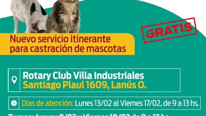 Nuestro servicio itinerante para castración de mascotas será en Rotary Club Villa Industriales (Santiago Plaul 1609, Lanús Oeste), donde comenzará el día Lunes 13 de Febrero hasta el Viernes 17, de 9 a 13hs. Se debe asistir con turno previo, el cual puede ser solicitado el Jueves 9 y Viernes 10 de 9 a 12 hs de manera presencial.
