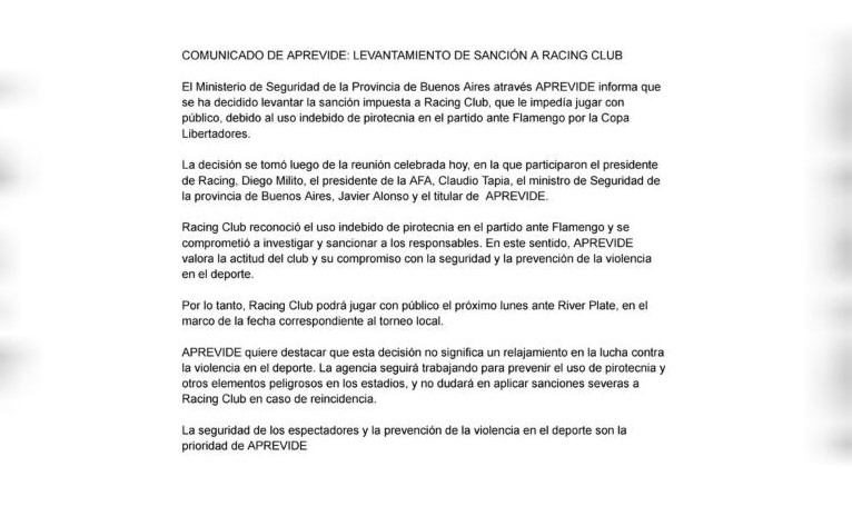 “El Ministerio de Seguridad de la Provincia de Buenos Aires através APREVIDE informa que se ha decidido levantar la sanción impuesta a Racing Club, que le impedía jugar con público, debido al uso indebido de pirotecnia en el partido ante Flamengo por la Copa Libertadores.