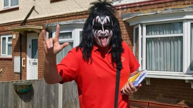 Un cartero británico encontró una manera de lo más curiosa de animar a los vecinos de su ruta durante la pandemia del coronavirus al maquillarse como el bajista y vocalista de KISS, Gene Simmons.
